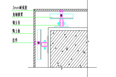 2、用螺栓穿過掛件安裝孔和絕緣墊片固定到橫梁上,螺栓先不擰緊,待陶土板檢查調整平整度后再擰緊。